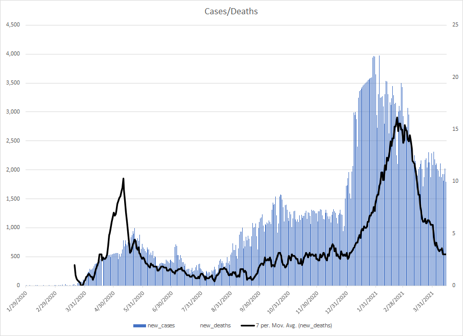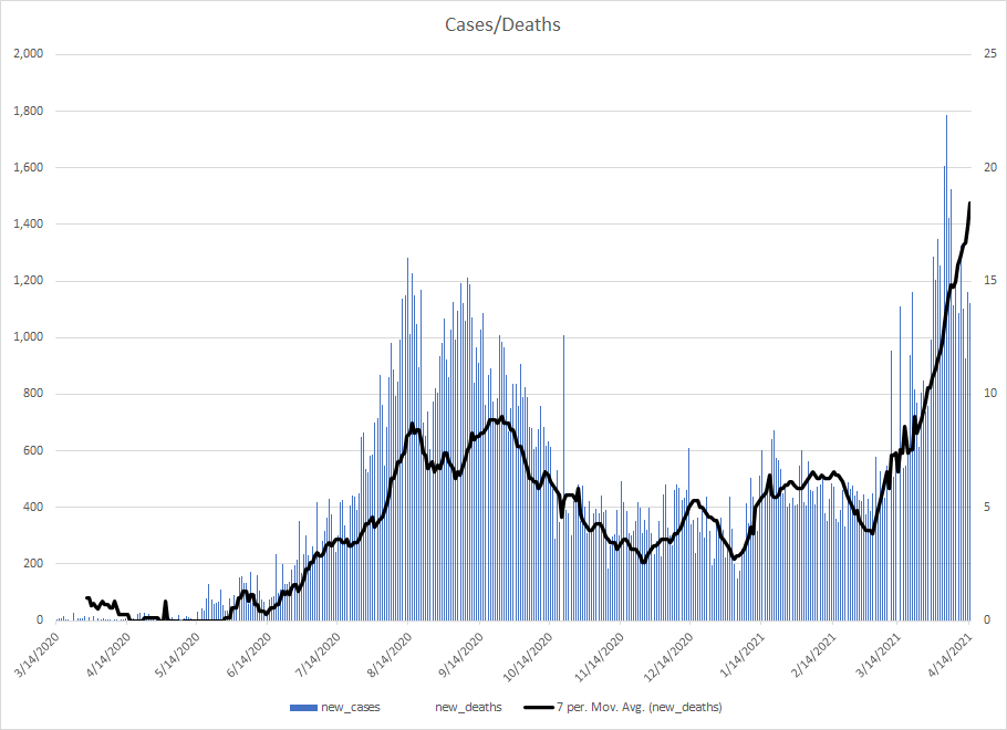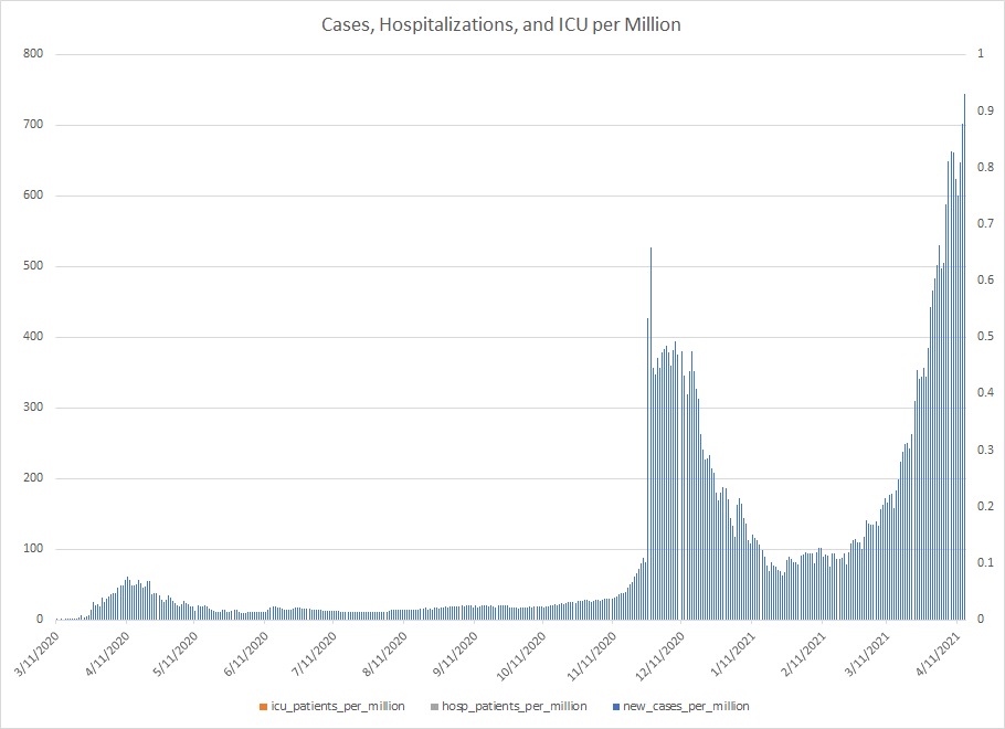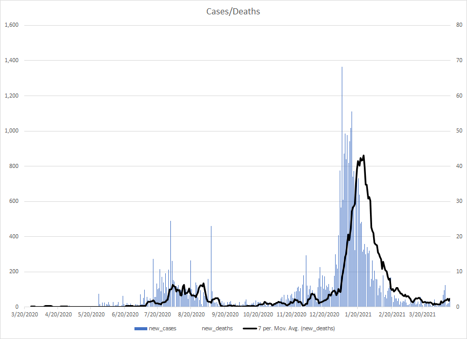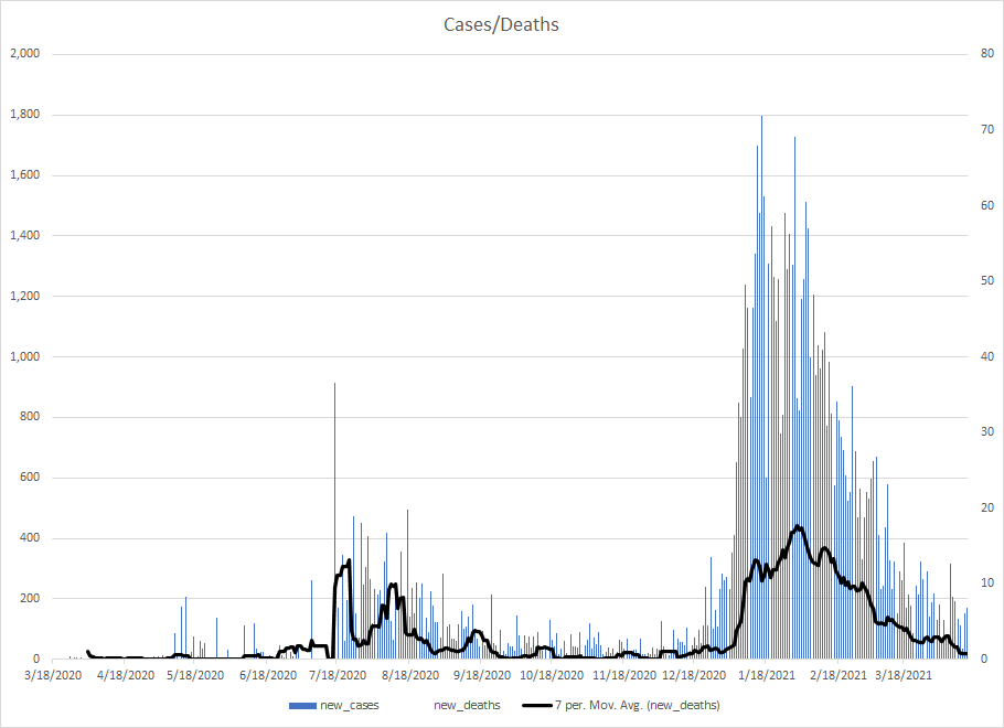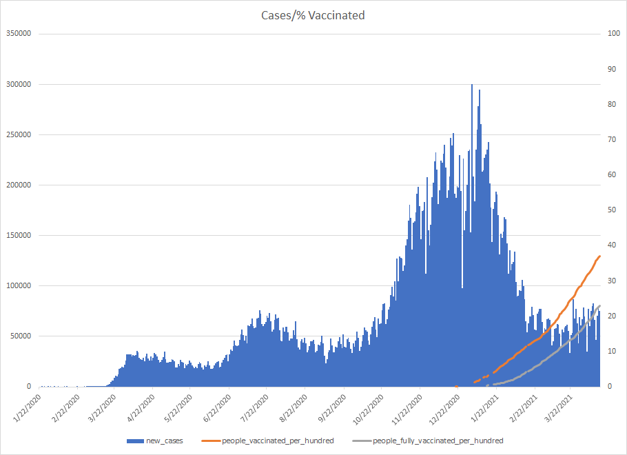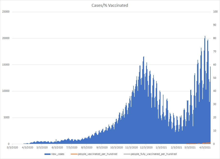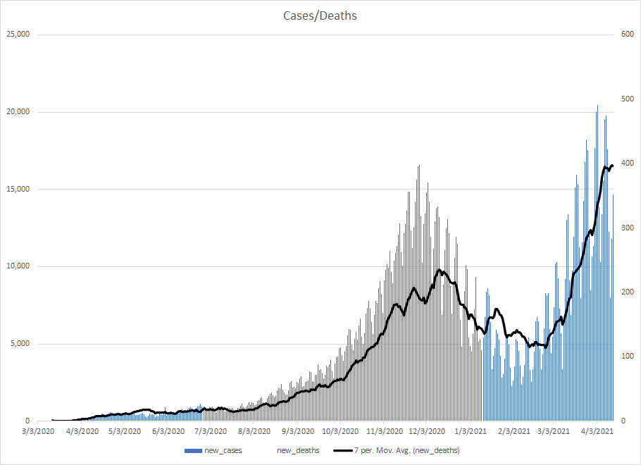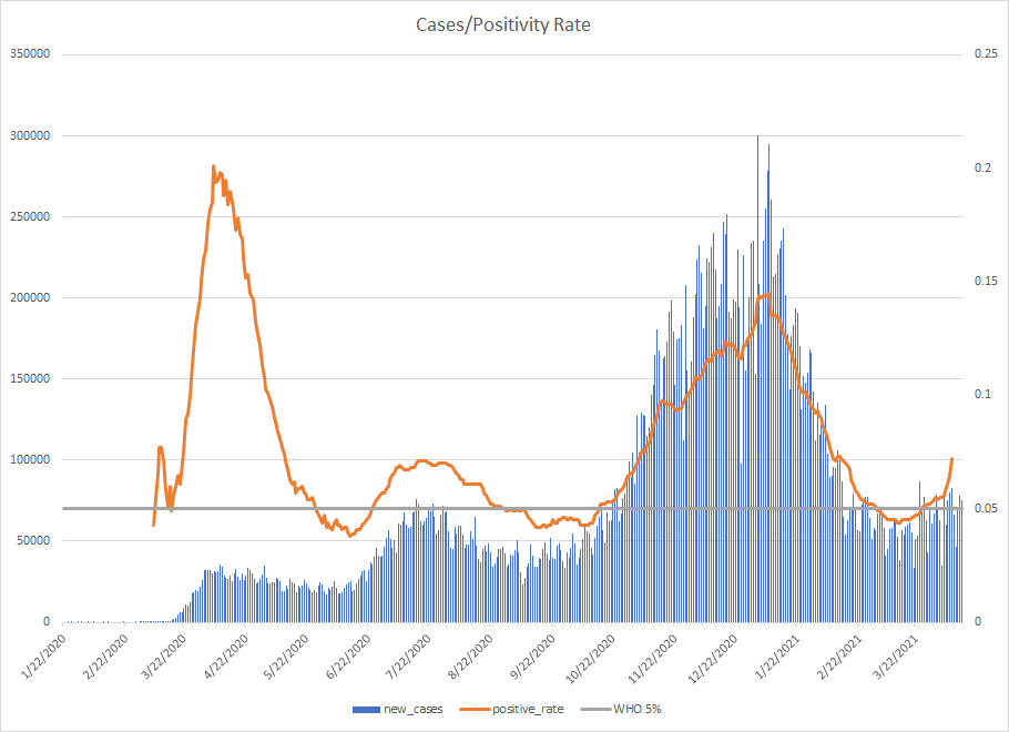 The most alarming rise though remains in India. I spoke with a team last week that has support operations out of India. They indicated to me that the prevailing attitude (at least anecdotally) was that everyone is tired of the pandemic and is going to let it go naturally. That would be a disaster for the people there, but for the whole world as well. At least in the US, most people don’t seem to understand how interconnected we are. Our supply chains and just in time delivery processes makes the entire world vulnerable. Apparently people haven’t learned yet from the incident in the Suez Canal with the Ever Given or the impact on multiple industries from silicon chip shortages. India supplies about 40-50% of the generic pharmaceuticals used in the US. In addition, India is also the largest COVID vaccine supplier in the world.