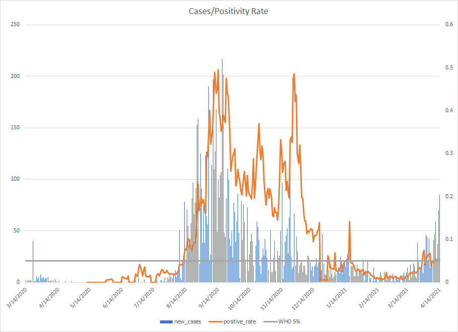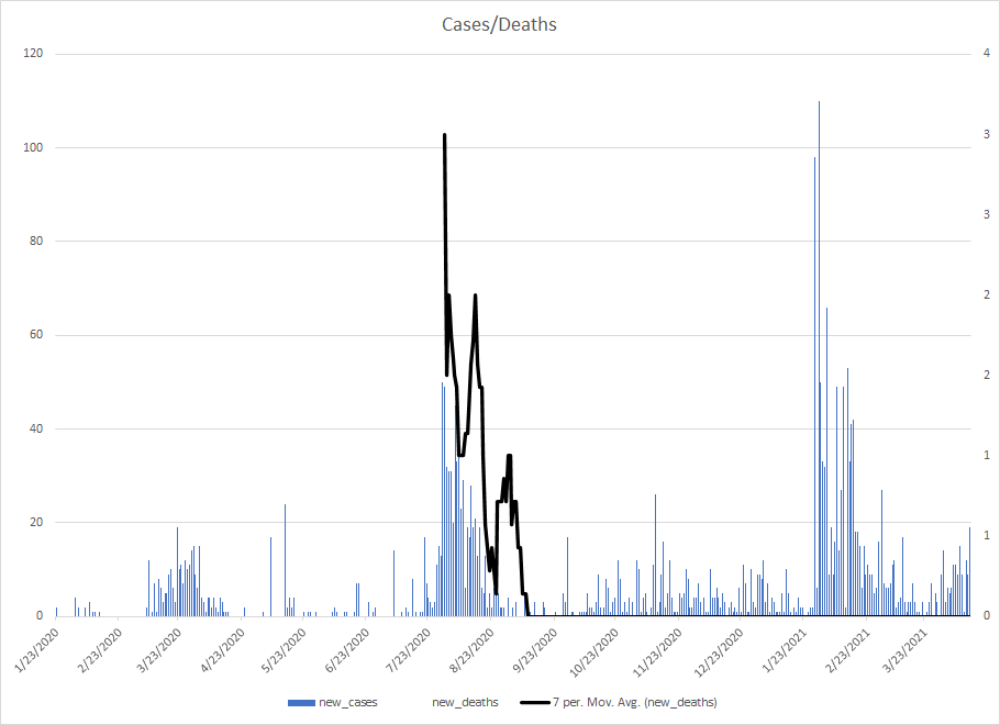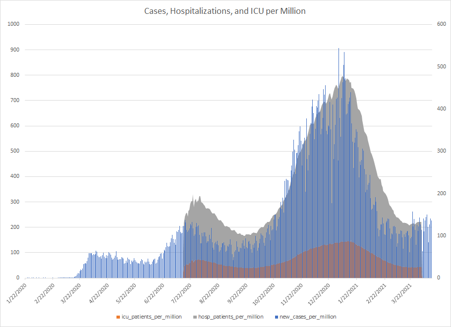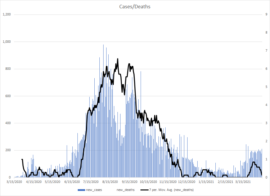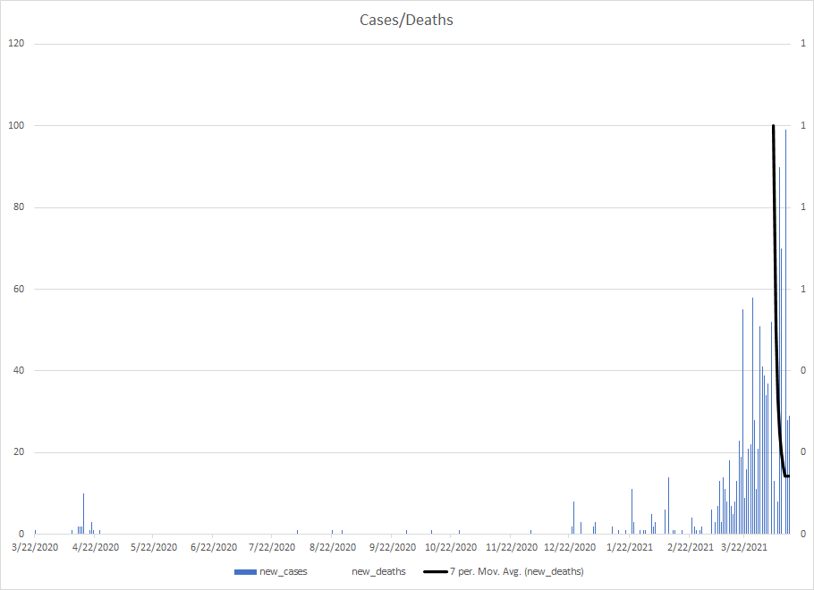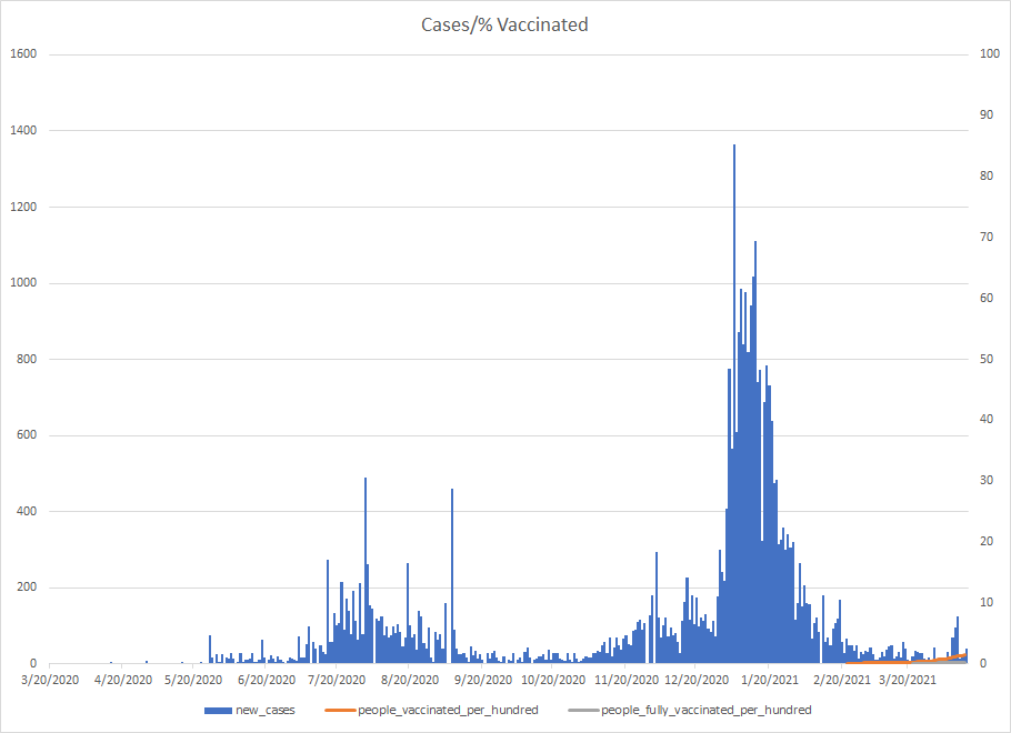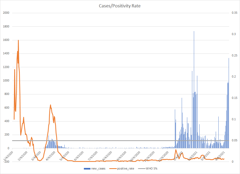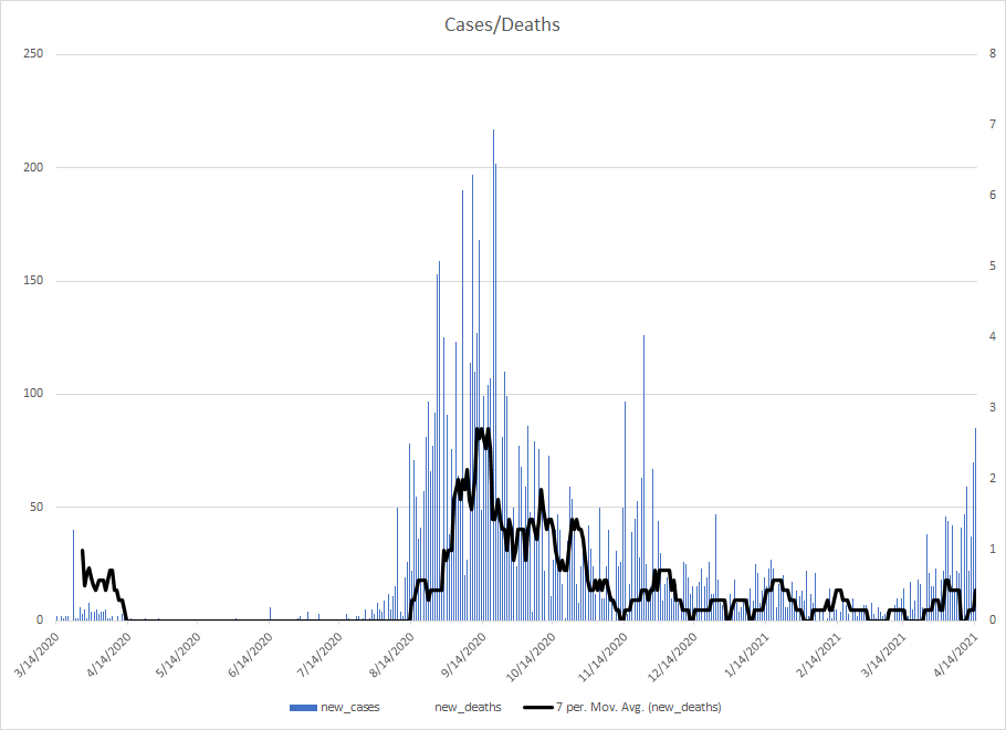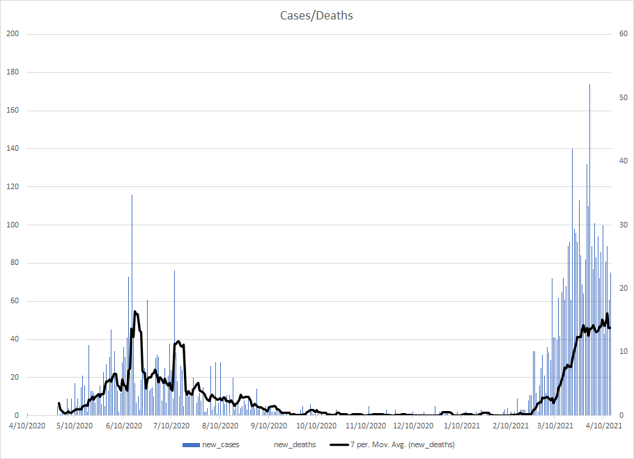 The most alarming rise though remains in India. I spoke with a team last week that has support operations out of India. They indicated to me that the prevailing attitude (at least anecdotally) was that everyone is tired of the pandemic and is going to let it go naturally. That would be a disaster for the people there, but for the whole world as well. At least in the US, most people don’t seem to understand how interconnected we are. Our supply chains and just in time delivery processes makes the entire world vulnerable. Apparently people haven’t learned yet from the incident in the Suez Canal with the Ever Given or the impact on multiple industries from silicon chip shortages. India supplies about 40-50% of the generic pharmaceuticals used in the US. In addition, India is also the largest COVID vaccine supplier in the world.