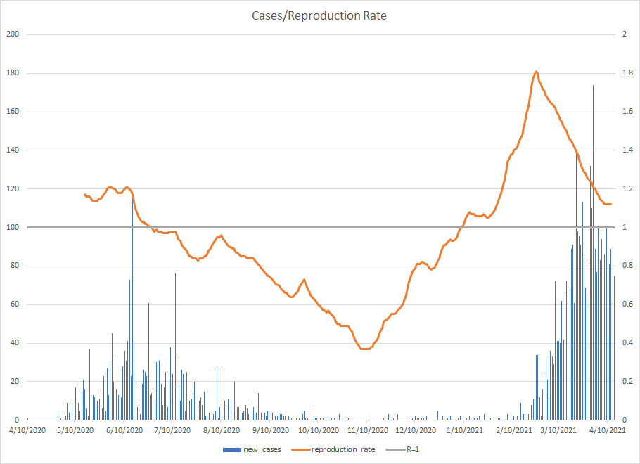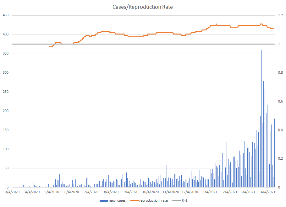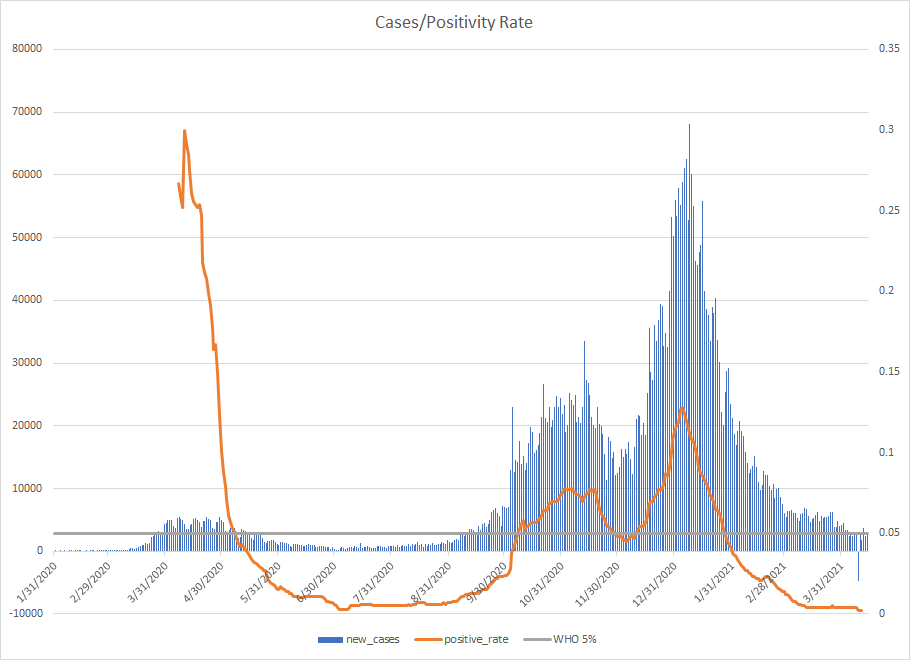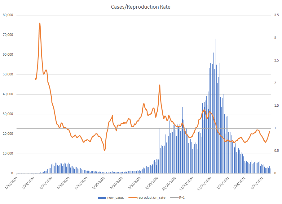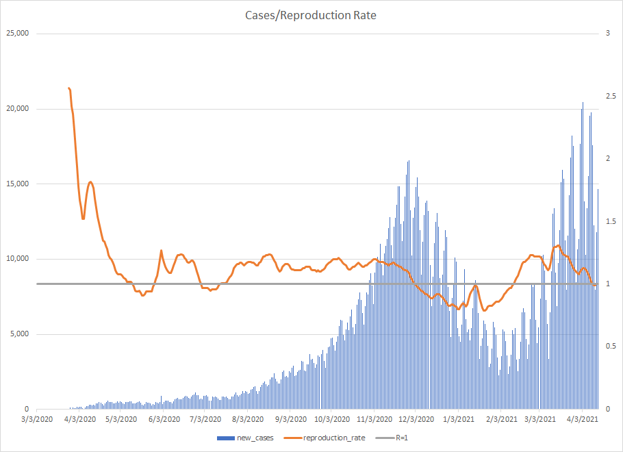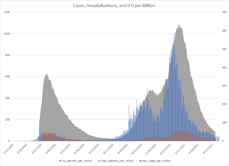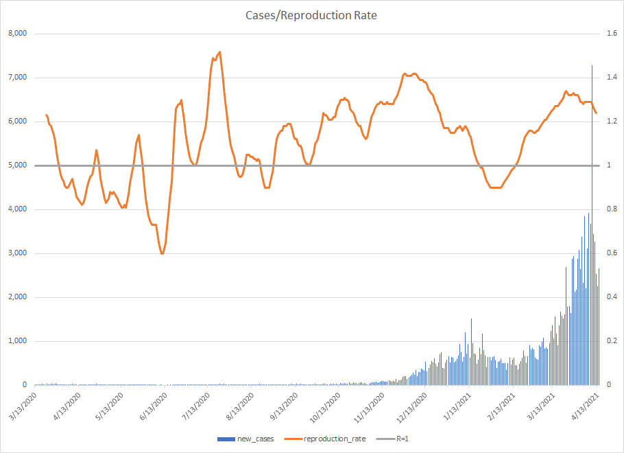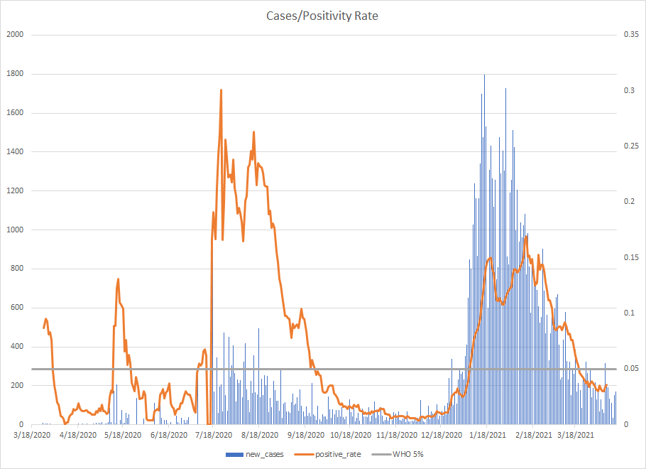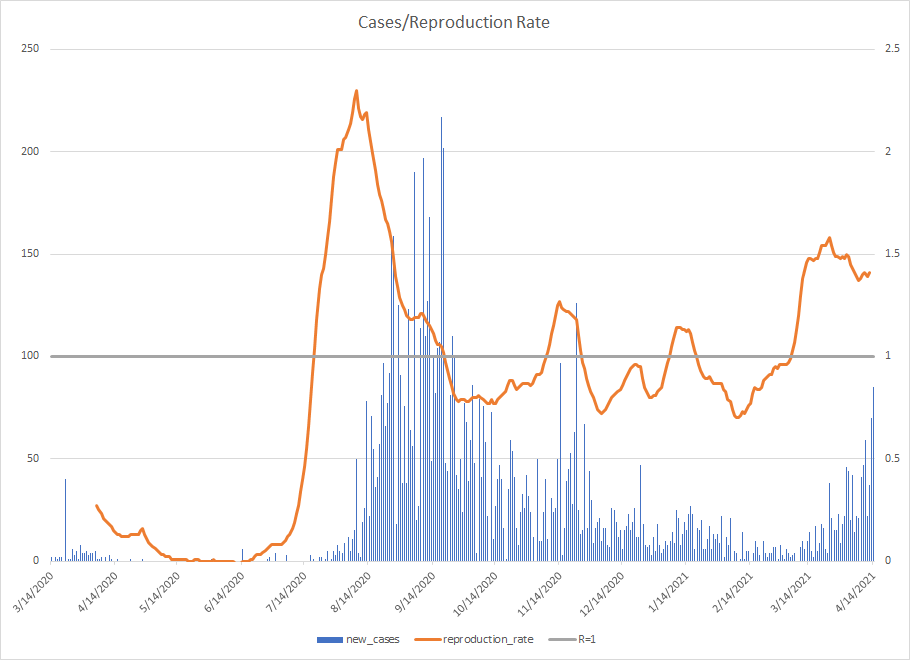 The most alarming rise though remains in India. I spoke with a team last week that has support operations out of India. They indicated to me that the prevailing attitude (at least anecdotally) was that everyone is tired of the pandemic and is going to let it go naturally. That would be a disaster for the people there, but for the whole world as well. At least in the US, most people don’t seem to understand how interconnected we are. Our supply chains and just in time delivery processes makes the entire world vulnerable. Apparently people haven’t learned yet from the incident in the Suez Canal with the Ever Given or the impact on multiple industries from silicon chip shortages. India supplies about 40-50% of the generic pharmaceuticals used in the US. In addition, India is also the largest COVID vaccine supplier in the world.