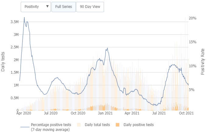 It’s also important to think about positivity rates in relation to cases every time that cases are assessed. It helps answer the question of whether the prevalence in a community is truly rising or falling or if it is just an artifact of more or less testing. This data is easy to find for every state from Johns Hopkins.